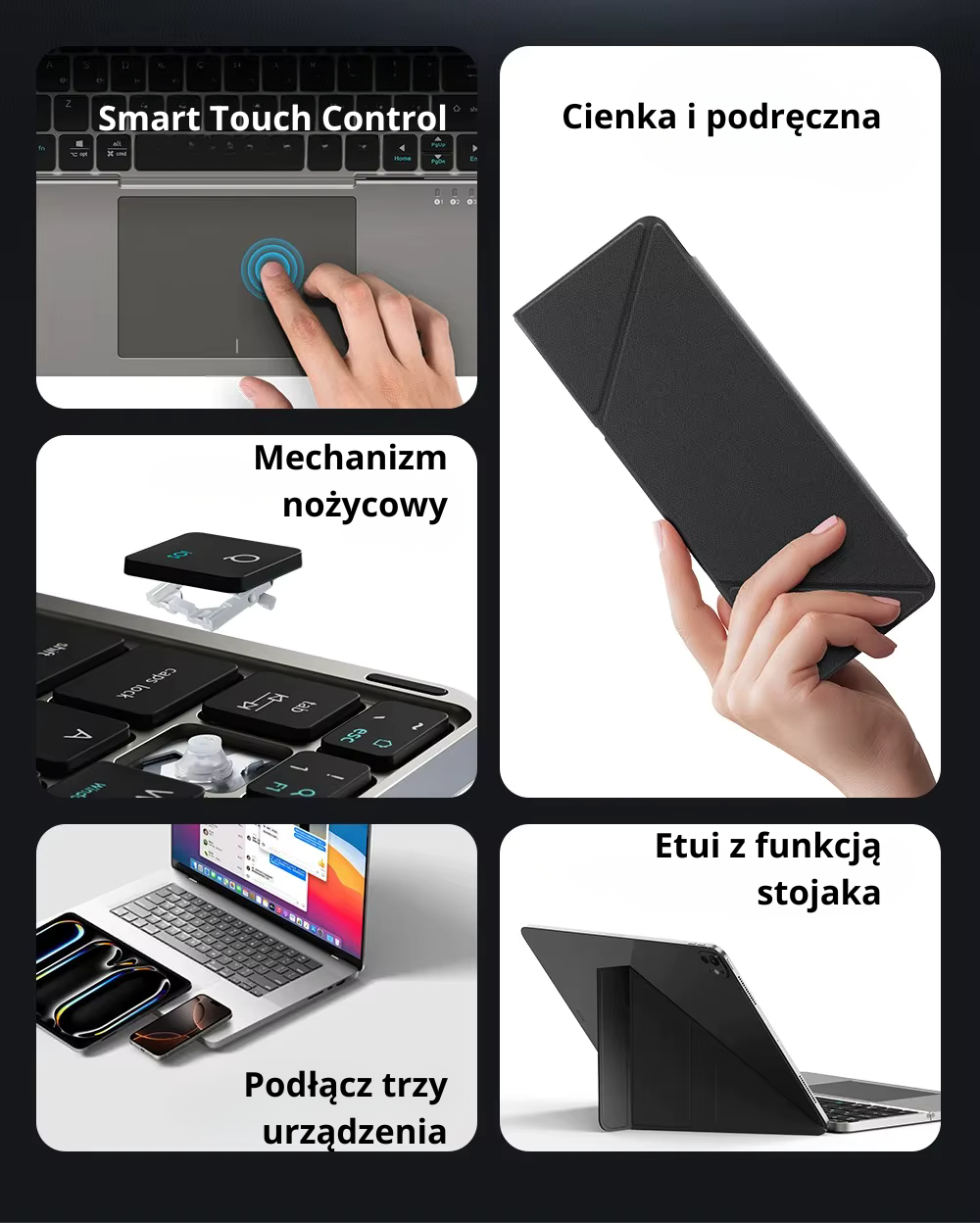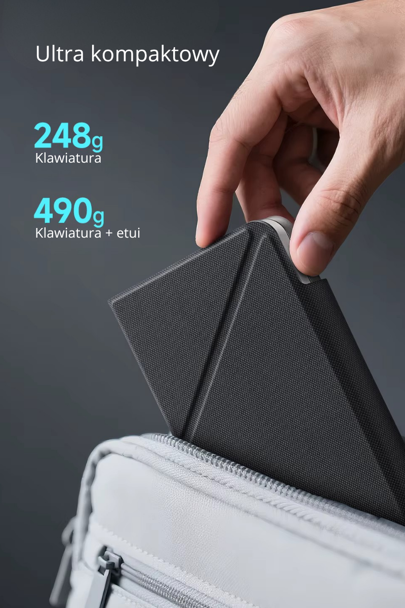 Ultra kompaktowa konstrukcja sprawia, że klawiatura mieści się w kieszeni, torbie czy plecaku. Lekka i składana – waży zaledwie 249 g bez etui i 490 g z etui, więc możesz zabrać ją dosłownie wszędzie. Idealna dla tych, którzy cenią mobilność i porządek na biurku.